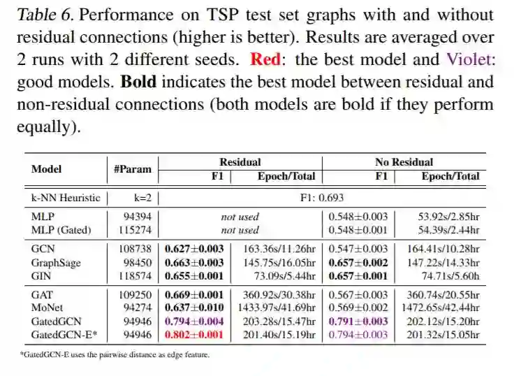 对于更大的数据集,GNN超越了与图形无关的NNs。表4和表5显示了ZINC, PATTERN, 和CLUSTER 数据集的显著性能提升,其中所有GNN都大大优于两个MLP基线。表6显示,所有使用残差连接的GNN都超过了TSP数据集的MLP基线。表3中报告的CIFAR10数据集的结果差别不大,尽管最好的GNN的性能明显优于mlp。