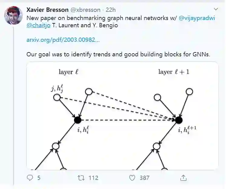【导读】图神经网络依然是当下的研究热点。来自新加坡南洋理工大学Xavier Bresson和Bengio联合发布了一篇论文《Benchmarking Graph Neural Networks》,如何构建强大的GNN成为了核心问题。什么类型的架构、第一原则或机制是通用的、可推广的、可伸缩的,可以用于大型图数据集和大型图数据集? 另一个重要的问题是如何研究和量化理论发展对GNNs的影响?基准测试为回答这些基本问题提供了一个强有力的范例。作者发现,准确地说,图卷积、各向异性扩散、残差连接和归一化层是开发健壮的、可伸缩的GNN的通用构件。