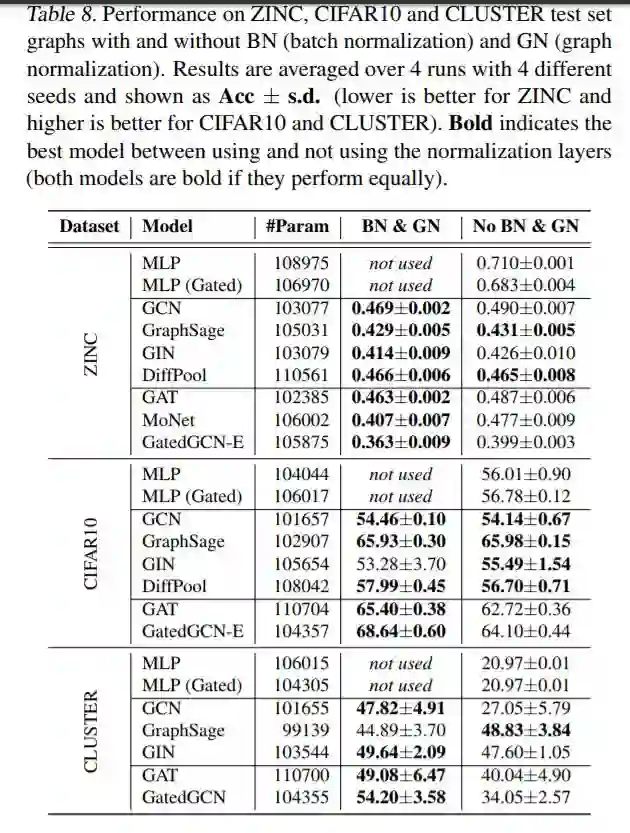 我们在表8中评估了标准化层对ZINC、CIFAR10和CLUSTER数据集的影响。对于这三个数据集,BN和GN显著改善GAT和GatedGCN。此外,BN和GN对ZINC和CLUSTER簇的GCN性能有促进作用,但对CIFAR10的GCN性能没有改善。除了集群之外,GraphSage和DiffPool不会从规范化中受益,但不会损失性能。总之,规范化层对于设计完善的gnn非常重要。