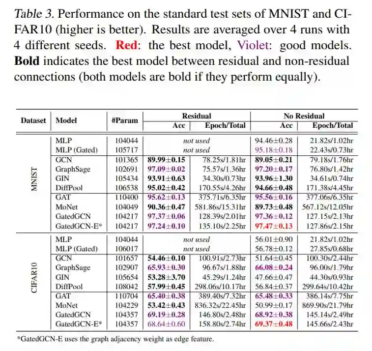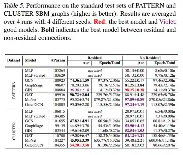 各向异性GNN是准确的。各向异性模型,如GAT (Velickovi ˇ c et al. ´ , 2018), MoNet (Monti et al., 2017) and GatedGCN (Bresson & Laurent, 2017) 在每个数据集获得最好的结果。另外,我们注意到GatedGCN在所有数据集上都表现良好。与各向同性的GNNs主要依赖于对相邻特征的简单求和不同,各向异性的GNNs使用复杂的机制(GAT的稀疏注意机制、GatedGCN的边缘门),这些机制很难有效地实现。我们为这些模型编写的代码并没有得到充分的优化,因此,速度要慢得多。这类GNN的另一个优点是它们能够明确地使用边缘特征,比如分子中两个原子之间的键类型。在表4中,对于ZINC分子数据集,使用键边特征的GatedGCN- e显著改善了没有键的GatedGCN的MAE性能。