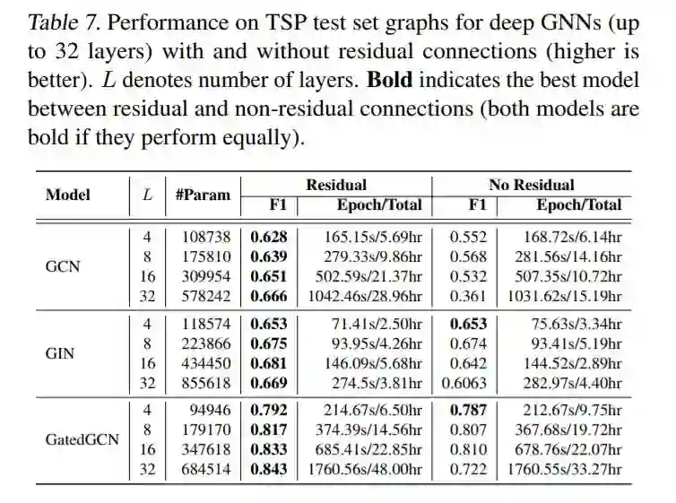 我们首先用L = 4层来测试RC的影响。对于MNIST(表3),RC并没有改善性能,因为大多数gnn很容易对该数据集进行过度拟合时。对于CIFAR10, RC增强了GCN、GIN、DiffPool和MoNet的结果,但对GraphSAGE、GAT和GatedGCN的性能没有帮助或降低。对于ZINC(表4),添加残差显著改善了GCN、DiffPool、GAT和MoNet,但略微降低了GIN、GraphSage和GatedGCN的性能。对于PATTERN和CLUSTER(表5),GCN是唯一明显受益于RC的体系结构,而其他模型在RC存在时可以看到其准确性的增加或减少。对于TSP(表6),没有隐式使用自我信息(GCN、GAT、MoNet)的模型受益于跳过连接,而其他gnn的性能几乎相同。