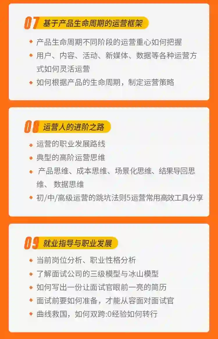 课程有八大运营知识板块,可以让你学到核心运营岗位必备的知识、技能,让你对核心运营岗位都有一套系统的工作方法,并有能力深耕2-3个领域,减少能力短板,打造核心竞争力。