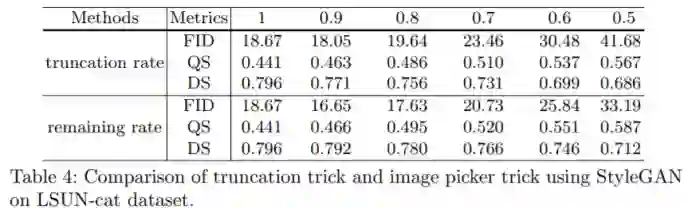 第二个有趣的应用是通过后处理丢弃一部分图片,让剩余图片有更好的生成质量,他们验证了其比传统的 truncation trick 能更好地兼顾质量和多样性,如下表 4 所示: