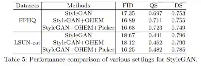 第三个应用是结合 OHEM(Online Hard Example Mining),在 GAN 训练过程中,通过给低质量生成图片更高的惩罚权重,他们可以让 GAN 生成出更高质量的图片,如下表 5 所示: