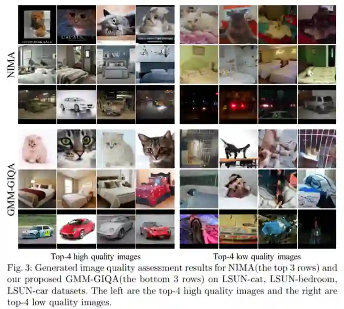 上图即展示了研究者对一个模型的生成图片进行打分的分布结果,在右下、右上、左上、左下中他们分别展示了模型评价的从高质量到低质量的生成图片,可以观察到该算法评价的质量基本上和人的评价是一致的。