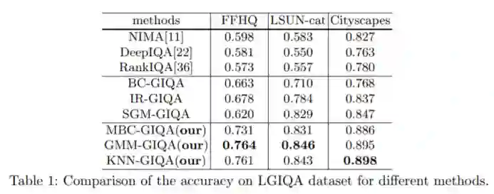 在研究者收集的 LGIQA 质量评估数据集上,GMM-GIQA 能够取得最好的结果,远远超过传统的图像质量评估方法。同时也最推荐大家使用 GMM-GIQA 的方法。与其他方法的对比结果如下表 1 所示: