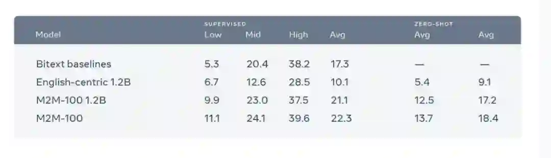 。这个单一的多语言模型表现得和传统双语模型一样好,并且比以英语为中心的多语言模型提高了 10 个 BLEU 点。