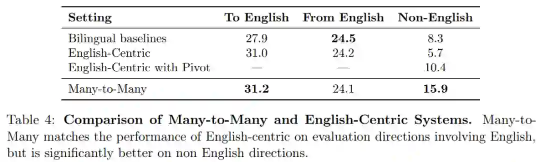 多对多和以英语为中心语言模型的比较。在包含英语的评估方向上,多对多模型与以英语为中心模型的性能相当,但在非英语方向上的性能要好得多。