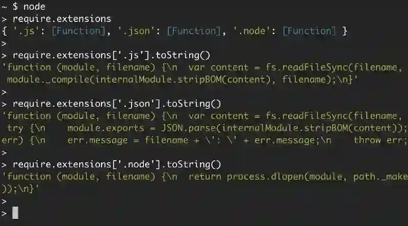 require.extensions 来查看对三种文件的支持情况: