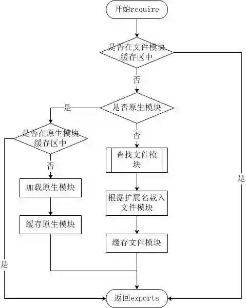 require 引入的对象主要是函数。当 Node 调用 require() 函数,并且传递一个文件路径给它的时候,Node 会经历如下几个步骤: