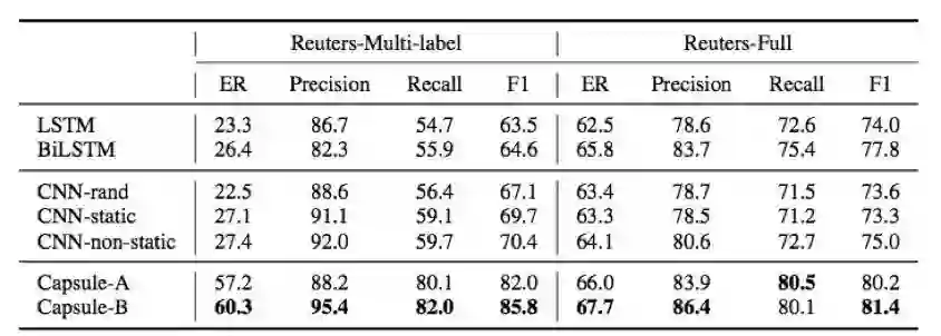 更重要的是,在多标签迁移的任务上(fromsingle-label to multi-label text classification),Capsule Network 的性能远远地超过了 CNN 和 LSTM。
