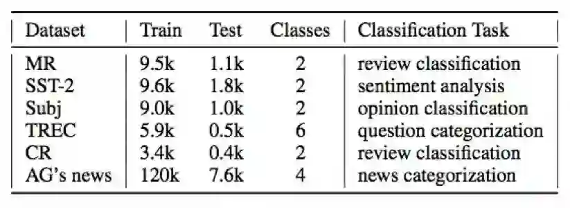 数据集:为了验证模型的有效性,我们在 6 个文本数据集上做测试,细节如下: