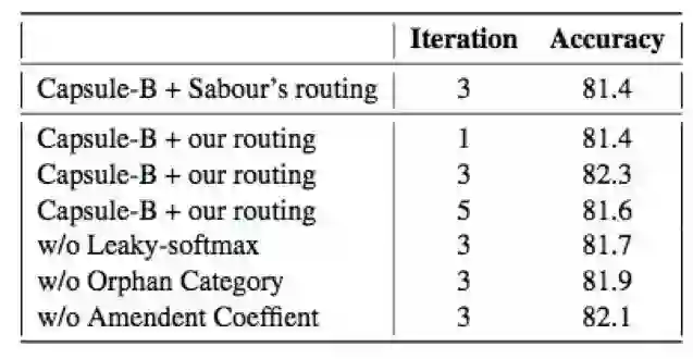 1. Orphan 类别:在胶囊网络的最后一层,我们引入 Orphan 类别,它可以捕捉一些背景知识,比如停用词。在视觉任务加入 Orphan 类别效果比较有限,因为图片的背景在训练和测试集里往往是多变的。然而,在文本任务,停用词比较一致,比如谓词和代词等。