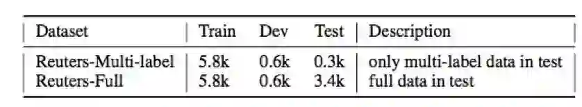 此外,我们重点进行了多标签迁移实验。我们将 Rueter-21578 数据集中的单标签样本作为训练数据,分别在只包含多标签样本的测试数据集和标准测试数据集上进行测试。详细的数据统计以及实验结果如下图所示。