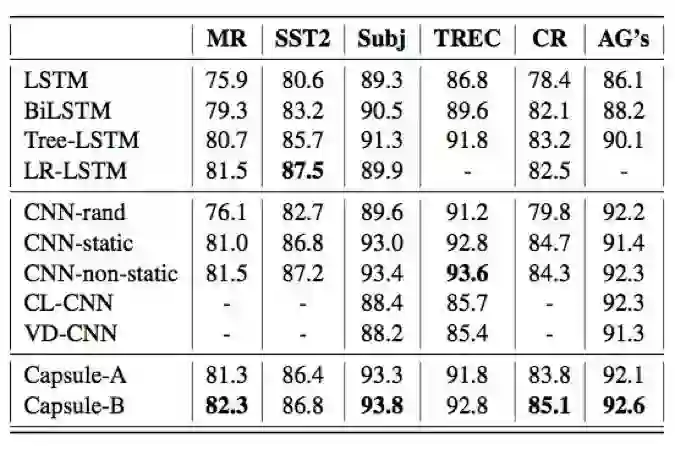 我们针对 Capsule Network 在文本分类任务上的应用做了深入研究。对于传统的分类问题,Capsule Network 取得了较好性能,我们在 6 个 benchmarks 上进行了实验,Capsule Network 在其中 4 个中取得了最好结果。