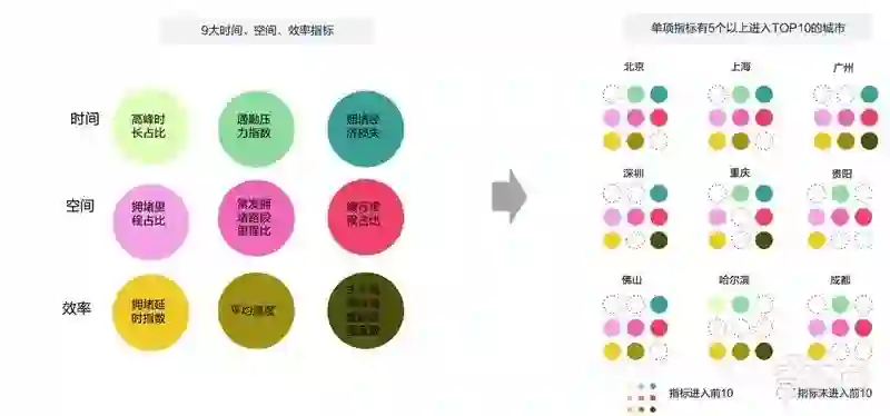 指标整体升维,从单一指标升级到9项指标。 新增指标分别有时间-高峰时长占比、 时间-通勤压力指数、时间-拥堵经济损失、空间-拥堵里程占比、空间-常发拥堵路段里程比、空间-缓行里程占比、效率-拥堵延时指数、效率-平均速度、效率-主干路高峰速度标准差系数。通过多项指标立体化综合评价城市拥堵的特征,从而做出全面立体的诊断,以期为管理部门提供量化有价值的全面参考。