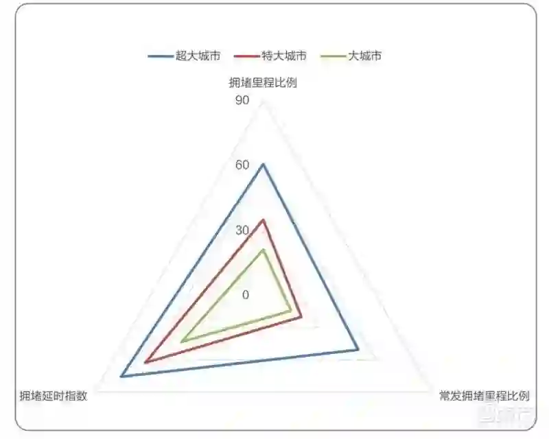 ▲各规模城市拥堵里程比例、常发拥堵里程比例、拥堵延时指数雷达图