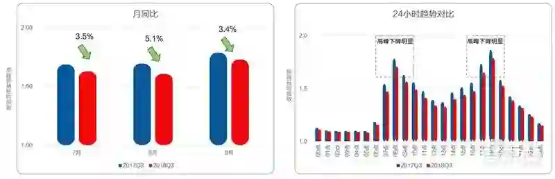 相比去年同期7-9月拥堵都有明显下降,全天24小时中白天呈现整体下降趋势。根据高德地图交通大数据监测的50个主要城市结果显示, 2018年7-9月同比去年都有明显下降,其中8月下降最大,达到5.1%,而全天24小时上来看,高峰峰值下降明显。2018Q3拥堵同环比都下降明显的原因可能与城市逐渐重视交通拥堵情况、路网持续改造升级、大数据交通治理、网约车出行减少等因素有关。