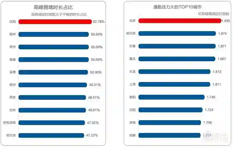 沈阳高峰拥堵时长占比最高,北京通勤压力最大。根据高德地图交通大数据监测的50个主要城市结果显示,沈阳高峰拥堵时长占比最高,有52.76%的时间拥堵高于平峰;北京早高峰拥堵延时指数1.935,排名第一;