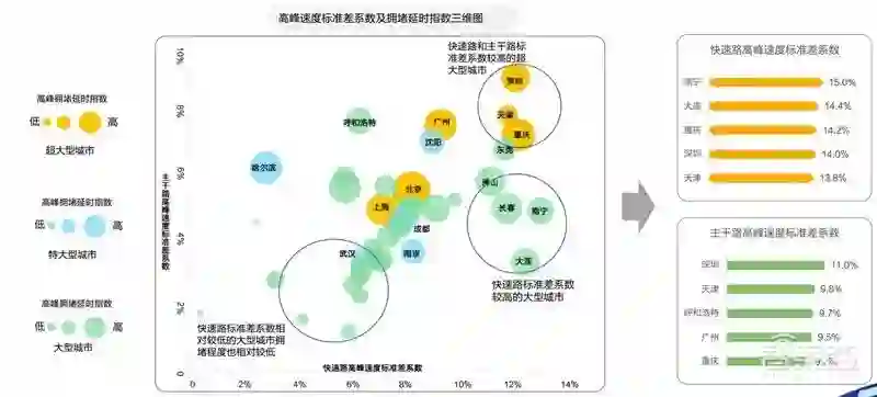 多数城市存在标准差系数高,拥堵延时指数相对也较高,快速路标准差系数最高的城市是南宁,而主干路高峰速度标准差最高的城市为深圳。高峰速度标准差系数,是高峰速度标准差与相应平均数对比的结果,从相对角度观察速度变化的差异和离散程度。系数越高说明城市高峰速度变化越大。不同规模的城市速度标准差系数分布情况也有所不同。超大型城市快速路和主干路相对标准差系数较高。从道路等级上来看,快速路的标准差系数普遍高于主干路,哈尔滨则相反,其主干路的标准差系数高于快速路,这于其快速路分布较偏,拥堵程度较低有关。再从高峰拥堵延时指数来看,速度变化较离散的城市多是拥堵程度相对较高的城市。