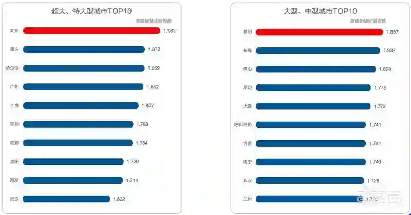 按城市规模划分堵城榜 ,超大特大型城市北京排名第一,大、中型城市贵阳第一。按照不同城市规模来对50个主要城市拥堵做排名,以期提供更多维度的量化参考。数据显示:本季超大、特大型城市中北京拥堵排第一,高峰拥堵延时指数1.982, 其次为重庆、 哈尔滨。 而在大、中型城市拥堵TOP10榜单中贵阳排名第一,其次为长春。