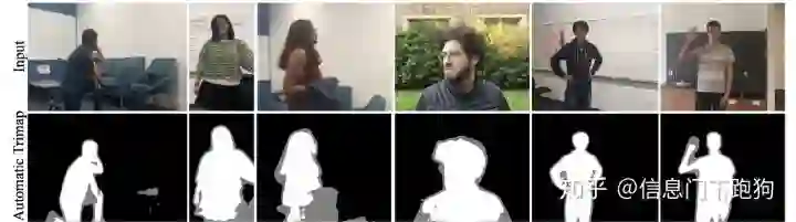 为了能够降低求解的难度,过去到现在绝大部分的方法都是基于人工手动标注的三元图(trimap)来提供更多的约束。三元图顾名思义就是将一副图像分成三个部分,分别是绝对前景(absolute foreground),绝对背景(absolute background)以及未知区域(unknown area)。基于三元图,我们只需要将未知区域的像素对应的alpha值进行求解就可以了。从2017年 CVPR Oral Deep Image Matting 以来,含有trimap作为网络输入的深度学习方法在http://alphamatting.com (image matting的一个benchmark网站)疯狂打破记录,可以说深度学习对含有trimap进行matting问题求解是有非常大的帮助的。同时Deep Image Matting文章还提出了一个dataset,叫做Adobe Deep Image Matting Dataset,这个dataset它含有431张前景及前景对应的ground-truth alpha matte作为train set,以及40张前景及前景对应的ground-truth alpha matte作为test set。论文里首次提出可以考虑在训练的时候对同一张前景与不同的背景进行合并得到composition image,然后扔进去网络进行训练。而背景池就是从MSCOCO里面进行采样。这样就可以构造一个非常大的train set进行训练。这样的操作也从2017年延续至今。下图的第二列就是trimap的示意图,我们可以看到灰色的部分就是所谓的unknown区域,也就是我们实际上要求解出alpha matte的区域。这个截图来自最近比较火的CVPR 2020 Background Matting:The World is Your Green Screen的 Figure 6,这篇文章下面我也会提及:)