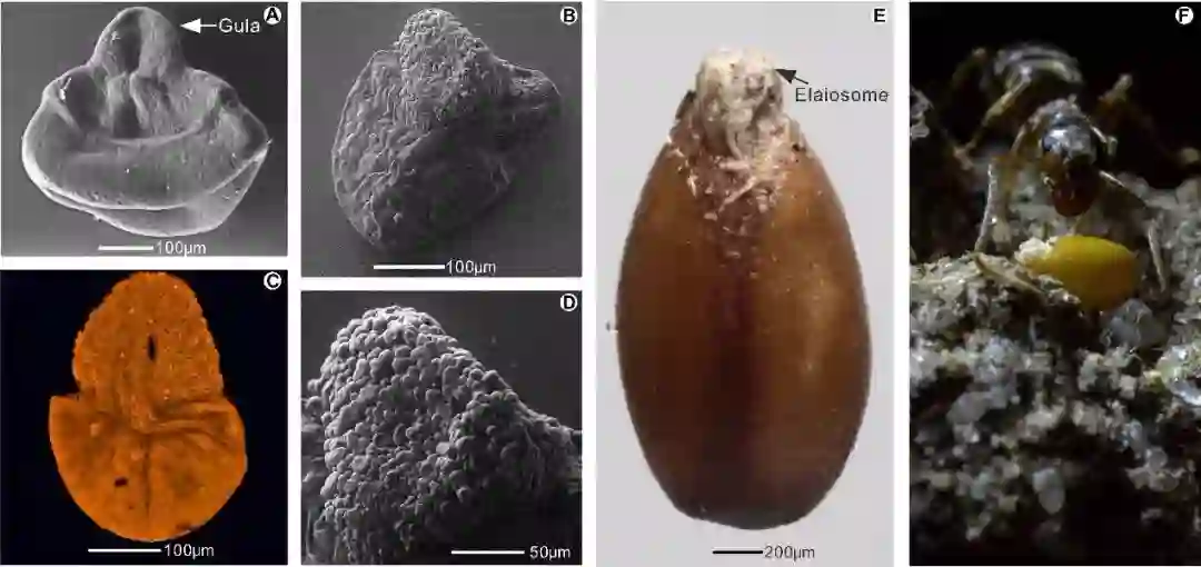 研究人员认为,这些位于大孢子近极面的淀粉团块,与现生一些种子上常出现的一种被称为油质体的可食附着体非常接近,主要用来吸引动物食取种子,从而实现种子的远距离传播。