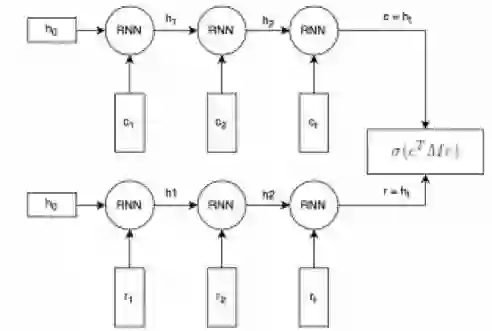 该模型思路直观:通过对偶的 RNN 模型分别把 context 和 response 编码成语义向量,然后通过 M 矩阵变换计算语义相似度,相似度得分作为监督信号在标注数据集上训练模型。