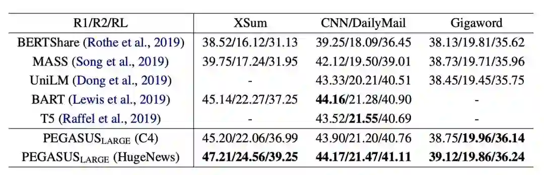 表2:PEGASUSLARGE与XSum、CNN/DailyMail和Gigaword上其他预训练模型的比较。最佳结果用粗体显示。