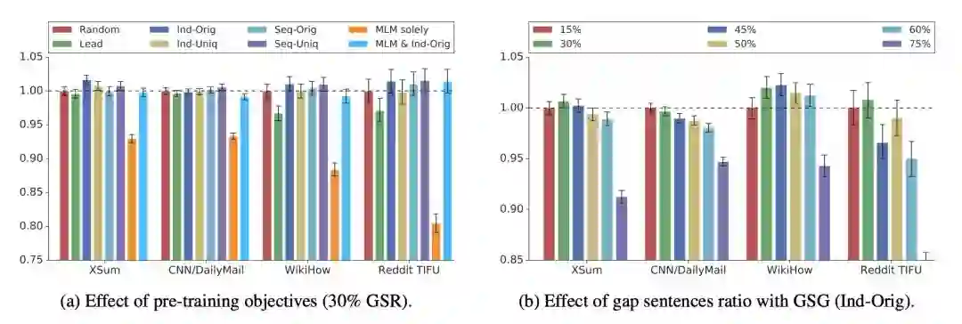 在这项工作中,我们提出了一个新的预训练目标GSG(Gap Sentences Generation),但为了进行比较,我们也评估了BERT的掩码语言模型目标(masked-language model objective)。