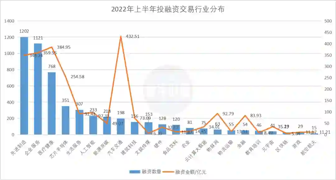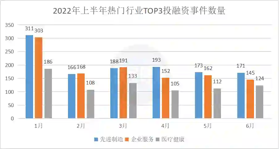 2022年上半年,先进制造、企业服务、医疗健康行业分别发生1202、1121、768起融资事件;1月融资数量最多,各自分别达311、303、186起,其他5个月的投融资事件较为稳定。