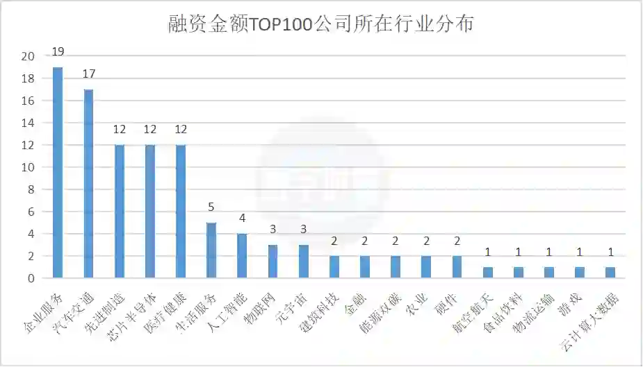从融资金额TOP100企业来看,企业服务、汽车交通、医疗健康、芯片半导体、先进制造项目数量比例处于前列,分别为19、17、12、12、12项,反映了资金的流向主要集中在硬科技、技术驱动型的项目中。
