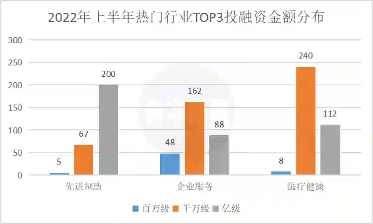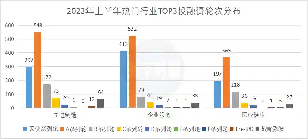 先进制造、企业服务、医疗健康是2022年上半年的投资热点TOP3,融资数量占比共达到56.8%;