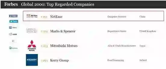 而在去年的“福布斯全球最值得信赖企业榜单”上,腾讯、阿里巴巴、百度、京东这些中国互联网巨头都没有出现在榜单上,唯一进入250强的中国互联网公司却是——网易。