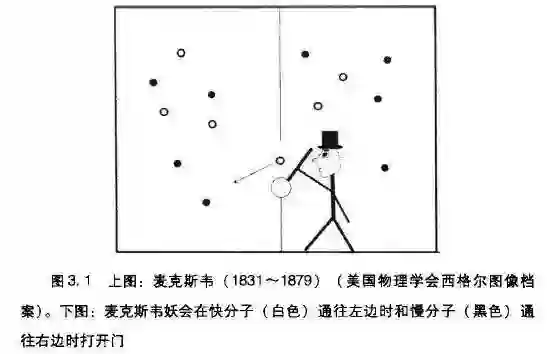 这时候,麦克斯韦提出了一个著名的思维实验 —— “ 麦克斯韦妖 ” 来质疑熵增定律。什么实验呢?假设一个盒子里,有一扇不消耗任何能量的门在盒子中间,中间有一个小妖,如果看到快的分子,就把它放到门左边;如果看到慢的分子,就把它放在门的右边。最后的结果就是:左边全是快分子,就会热;右边全是慢分子,就会冷。然而却没有做功,最终左边的熵,减少了。