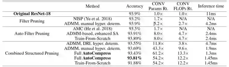 ResNet-18 在 CIFAR-10 数据集上更是达到了 54.2 倍结构化剪枝压缩率无精度损失。