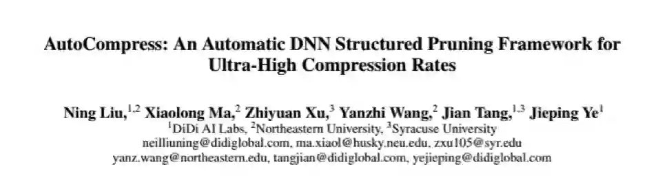 2020 年 2 月 7 日-2 月 12 日,AAAI 2020 将于美国纽约举办。不久之前,大会官方公布了今年的论文收录信息:收到 8800 篇提交论文,评审了 7737 篇,接收 1591 篇,接收率 20.6%。本文介绍了滴滴 AI Labs 与美国东北大学合作的一篇论文《AutoCompress: An Automatic DNN Structured Pruning Framework for Ultra-High Compression Rates》