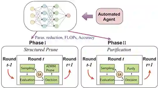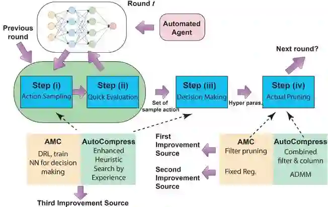 通过基于启发式搜索算法的自动化代理模块的指导,AutoCompress 框架进行模型自动化剪枝主要分为两个步骤,步骤 1: