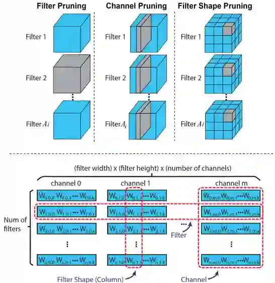 首先,结构化剪枝包含三种剪枝维度,输出通道剪枝(filter pruning),输入通道剪枝(channel pruning)和输出通道形状剪枝(filter shape/column pruning),如图 2 上所示。
