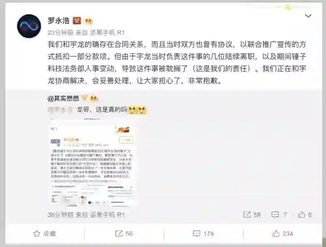 随后,锤子科技CEO罗永浩在微博上对此进行了回应,表示与宇龙的确存在合同关系,称当时双方签订协议,以联合推广宣传的方式抵扣一部分款项。但“由于宇龙当时负责这件事的几位陆续离职,以及期间锤子科技法务部人事变动,导致这件事被耽搁了”,他补充表示“这是我们的责任”,称正在和宇龙协商解决,会妥善处理。
