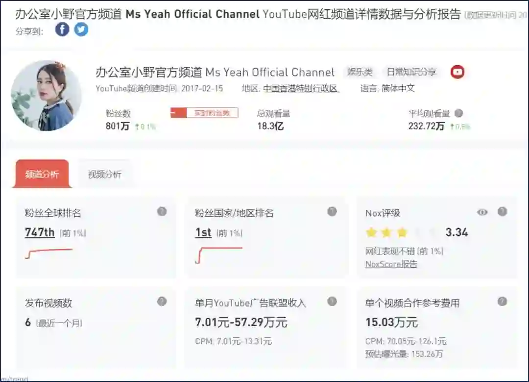 办公室小野在YouTube上的各项数据,收入单位为美元(数字来自海外网红营销平台Nox Influencer)