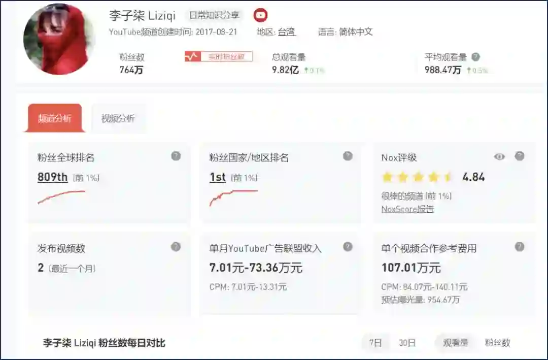 而Nox Influencer的统计数据显示,李子柒在YouTube上的cpm为7.01-13.31美元(折合人民币49.14-93.3元)。