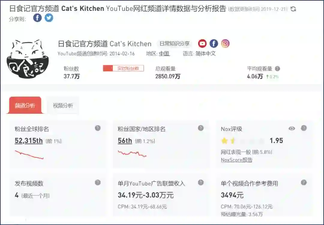 日食记在YouTube上的各项数据,收入单位为美元(数字来自海外网红营销平台Nox Influencer)