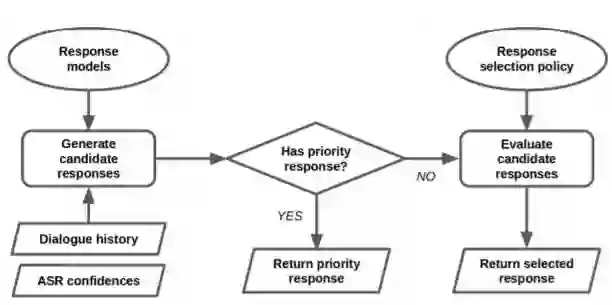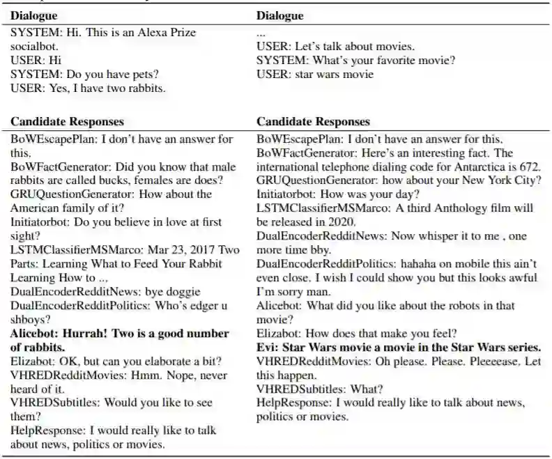 该系统包含 22 个响应模型,包括基于检索的神经网络、基于生成的神经网络、基于知识库的问答系统和基于模板的系统。候选模型响应的示例如表 1 所示。