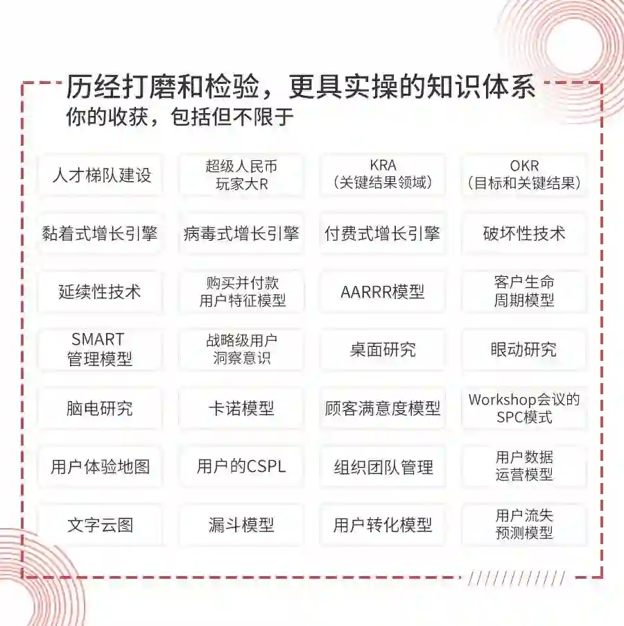 课程从“产品规划、产品运营、用户研究、数据分析”四大版块阐述了产品总监必备的核心能力体系,在详解了系统思维框架之外精讲多个行业产品跨界打法和落地实操技能。