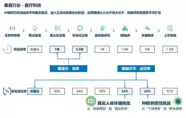 第三,在医疗科技领域,随着云计算、大数据、人工智能等技术的日益成熟,诸多新兴科技正在越来越广泛地在医疗领域开花结果。以AI制药为例,从全球范围来看,AI制药企业已经完成技术、概念的验证,进入主流化和商业化阶段。并且AI制药应用领域不断扩张,将从小分子向大分子发展,同时应用场景也将从靶点发现、化合物筛选、化合物优化进一步向药物研发后端扩展。伴随全球发展浪潮,中国AI制药行业发展进入新阶段,企业将从单环节业务向平台化能力发展。
