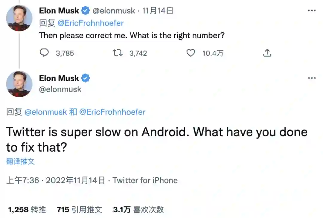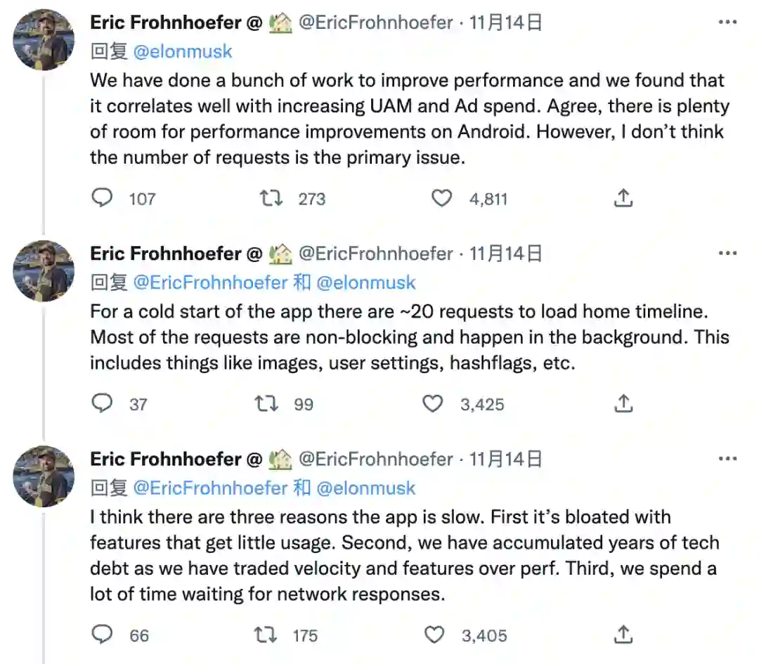 「我们已经做了大量工作来提高性能,我们发现它与增加 UAM 和广告支出密切相关。我同意(马斯克提到的一点),(Twitter)在 Android 系统上还有很多性能改进的空间。但是,我不认为请求的数量是主要问题。