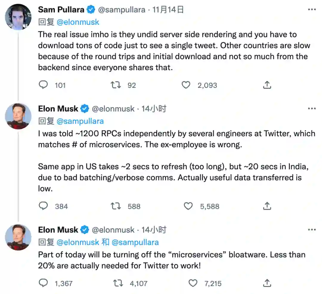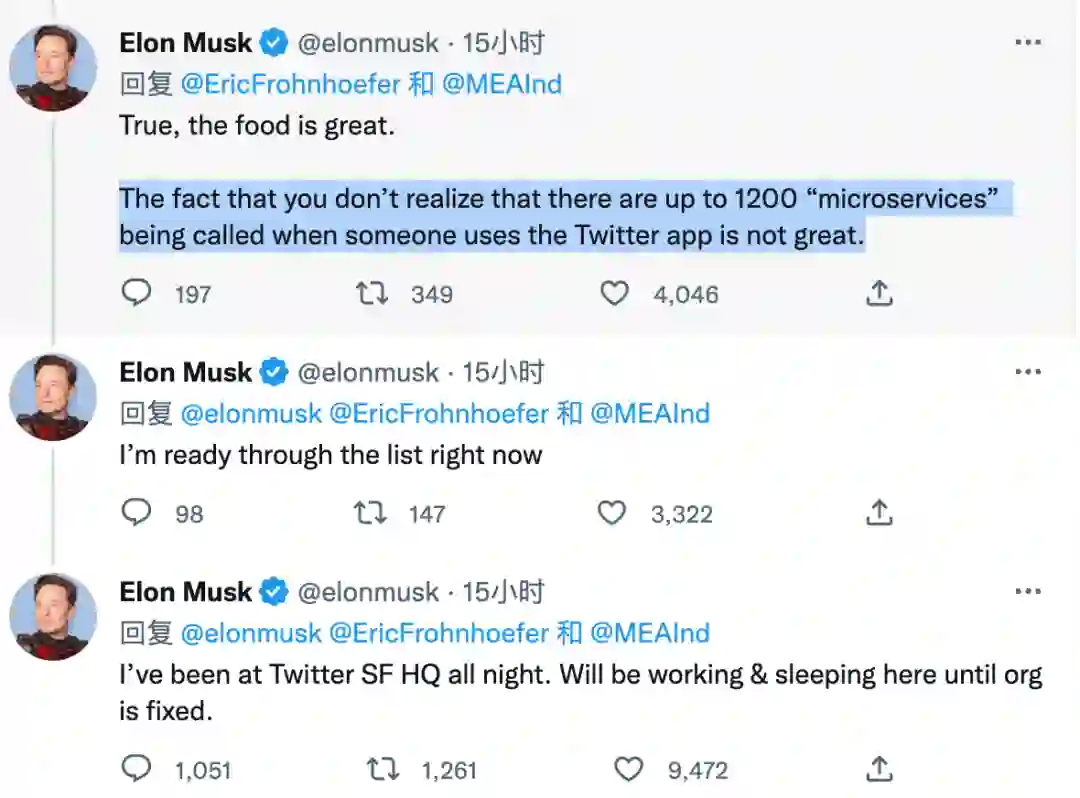 本来以为是一场纯粹的技术问题讨论,然而画风却逐渐走偏。被这样“打脸”之下,各方的面子上也有些不太好看,似乎是为了澄清最初的推文,马斯克再次在这名工程师的推文下方回应称,“事实上,当有人使用 Twitter 应用程序时,有多达 1200 个’微服务‘被调用,你没有意识到这一点并不好。”