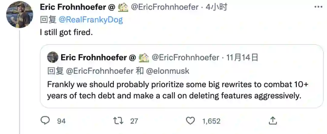 然而,在将 Twitter 强力瘦身之际,除了员工被裁、主动辞职之外,近日一位名为 Eric Frohnhoefer 的 Twitter 工程师在秉持「忠言逆耳利于行」之意下,却遭到了现任老板马斯克的直接点名——「He’s fired」(他已被解雇)。