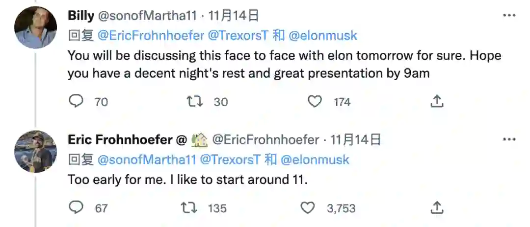 鉴于双方直接在 Twitter 上争锋相对,也有不少网友劝解 Eric Frohnhoefer,「明天你肯定会和 Elon 面对面讨论这个问题。希望你在早上 9 点前有一个体面的休息和精彩的分享」。